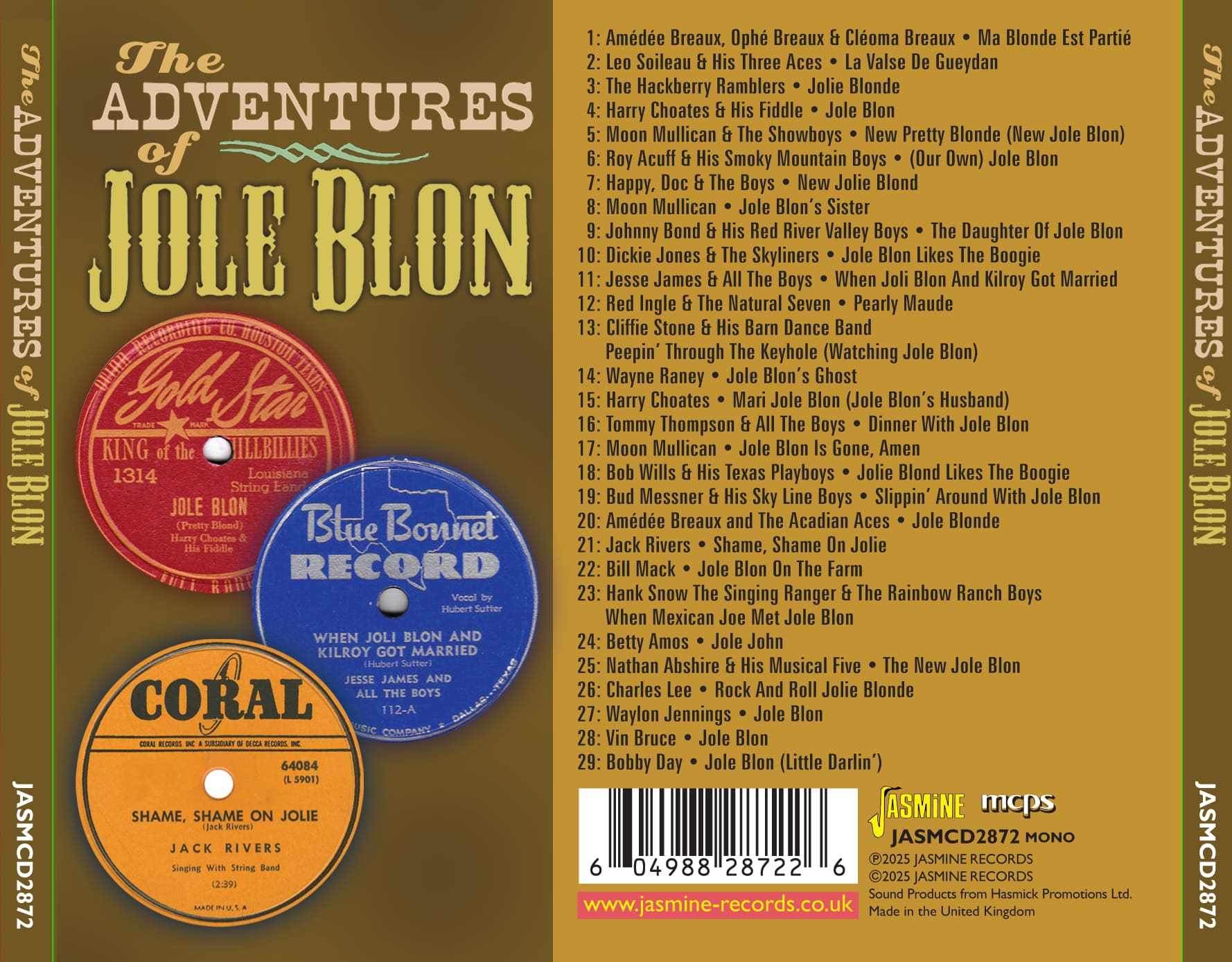 • Choates’ 78rpm record not only inspired a raft of cover versions, it provided the impetus for an entire subculture of spinoffs, many of which are featured on this unique compilation, which presents “THE ADVENTURES OF JOLE BLON”, between 1929 and 1962.