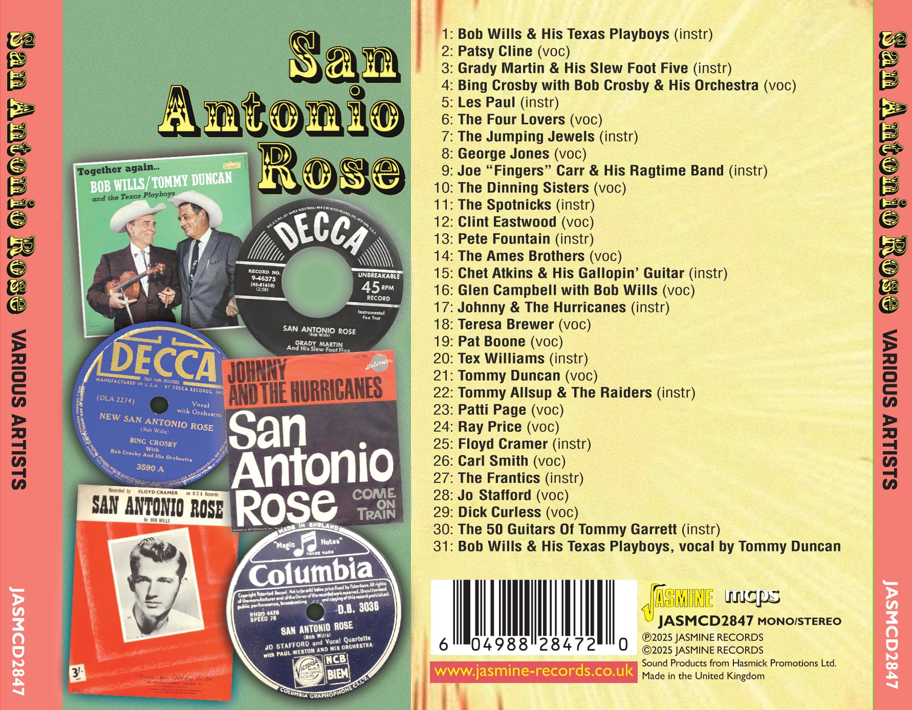 • ‘SAN ANTONIO ROSE’ was originally a fiddle tune, written by Bob Wills in 1938, to which he added lyrics two years later, sung by Tommy Duncan; both versions were million-selling, crossover Hillbilly/Pop hits.