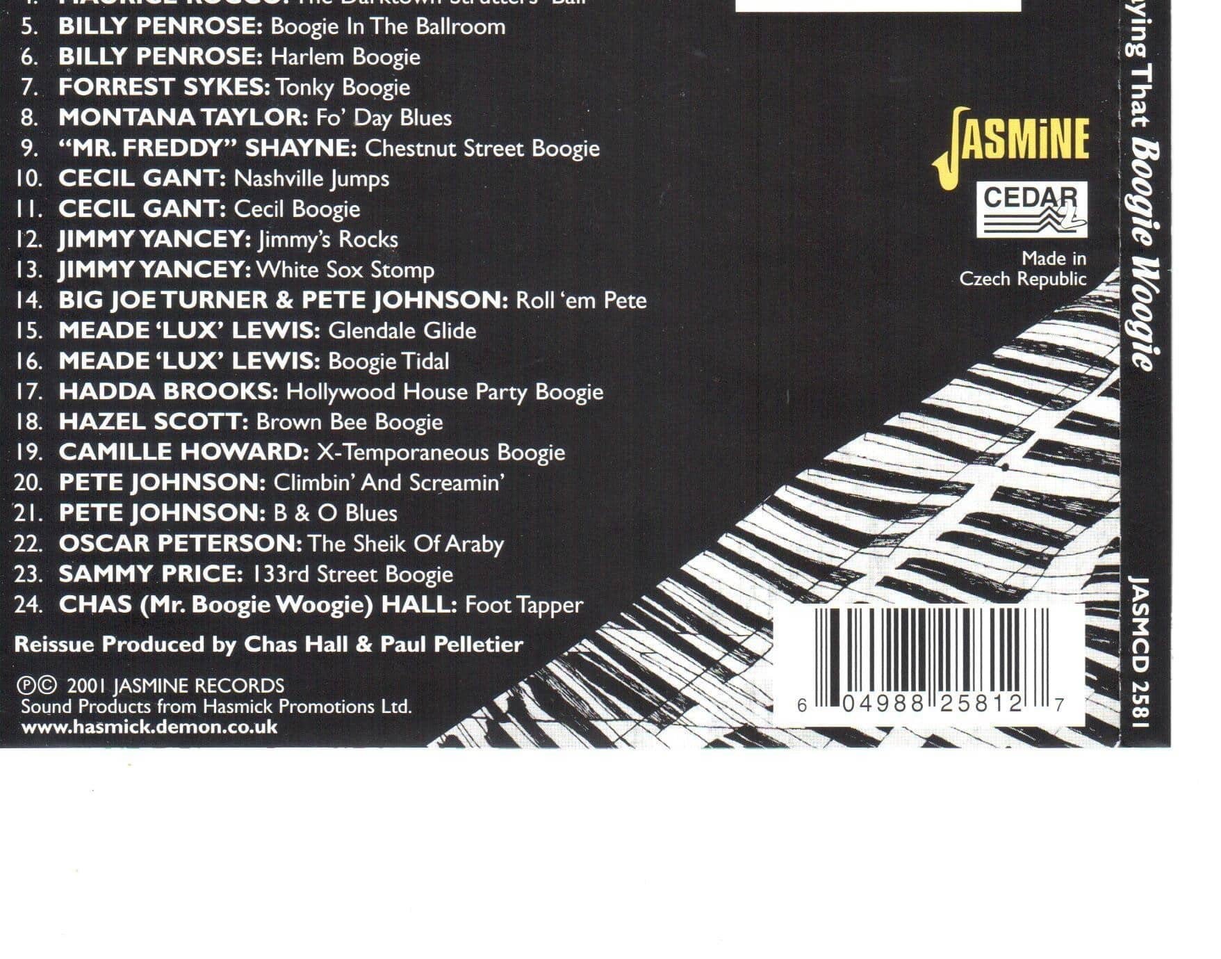 A while back, JASMINE issued a series of three Boogie Woogie CDs, each devoted to a particular format of the genre: Volume One (JASMCD 2538) featured piano soloists, Volume Two (JASMCD 2539) was devoted to small groups, and Volume Three (JASMCD 2540) covered the Big Bands. Starting with this fresh compilation, it is JASMINE's intention to travel much further along the road of the pounding piano, bass notes to the left, trebles to the right. If Boogie Woogie had a ‘Holy Trinity’, then it was formed by Albert Ammons, Pete Johnson and Meade Lux Lewis all featured here. We hope you will enjoy this ‘classic’ slice of Boogie Woogie and are hungry for more - let the piano roll!