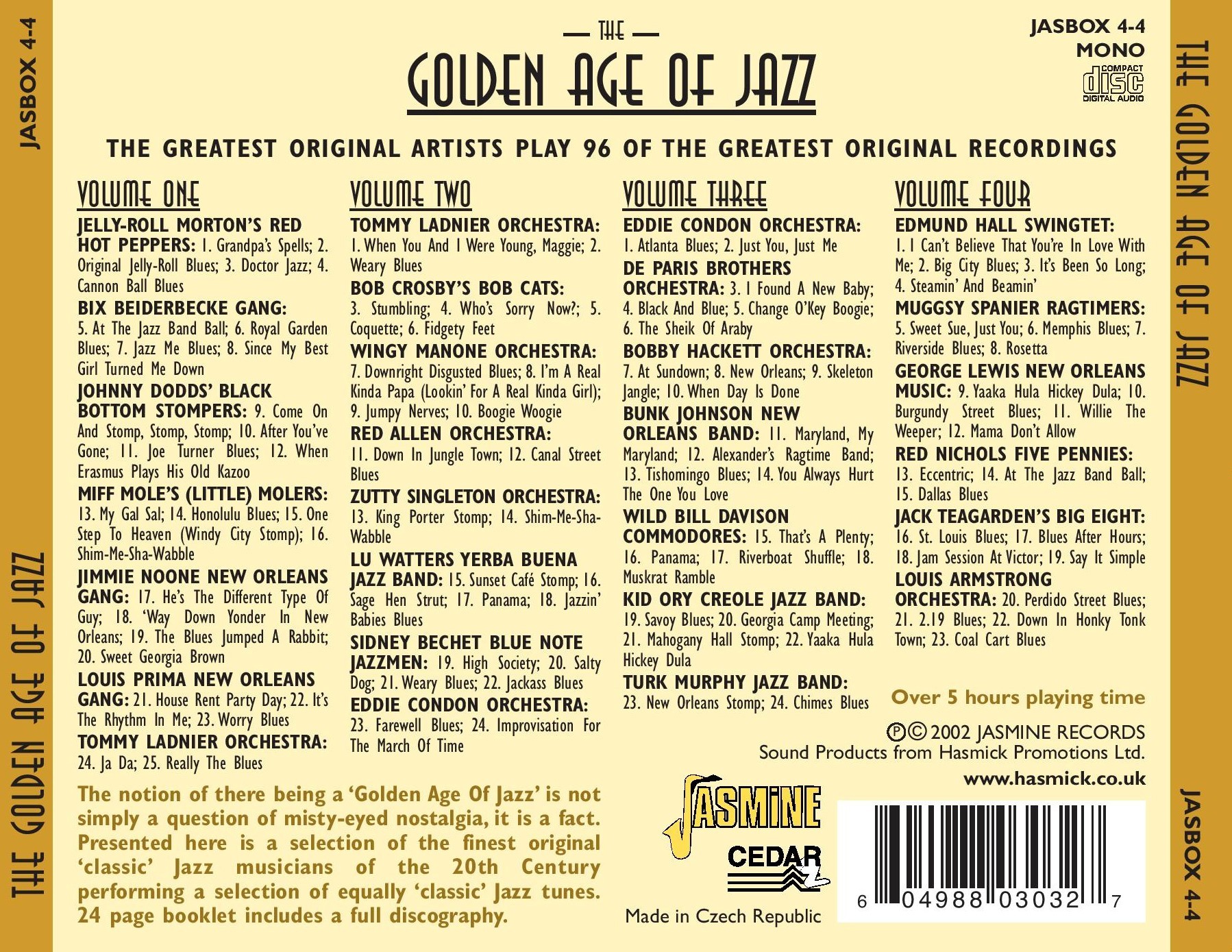 Jazz music is now a century old and any of the turbulent periods through which the art-form has passed could be accurately justified as having been a 'Golden Age'. The music's incubation in New Orleans, its travel up to Chicago, the Swing era, the Be-bop revolution, the 'Birth of the Cool' and the arrival of the abstract improvisers all occurred within the relatively brief time frame of sixty or so years, each successive style having its ardent believers and its cynical detractors. Few eras were as rich in diverse talent as the period covered in this four-disc retrospective. This was the age of classic Jazz, an era in which the originators and leading lights of the music's development co-existed side by side with some of its finest consolidators, the years in which the Jazz message travelled all over the United States from New Orleans to Chicago, to New York, Los Angeles and beyond.