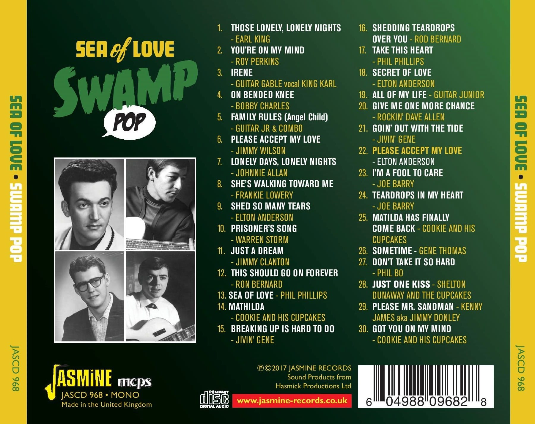 Jimmy Clanton and Rod Bernard are very much the epitome of the genre and tracks such as 'Just a Dream' and 'This Should Go On Forever' are great examples of the Louisiana rock and roll sound. And no swamp pop collection should be without Phil Phillips' million-selling Billboard smash, 'Sea of Love' or the greatest of swamp pop hits 'Mathilda' by Cookie and His Cupcakes.