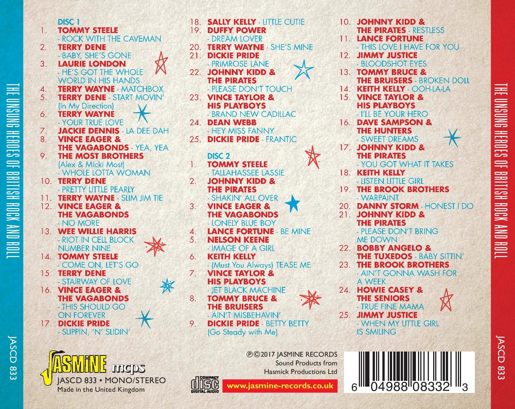 This excellent 2CD set from Jasmine turns the spotlight onto some of the lesser known rock and roll acts that surfaced on our shores. Although Tommy Steele can't quite be labelled as unsung, he was the first teenage star to perform rock and roll and scored the first home grown hit with the original song 'Rock With The Caveman'. The journey rocks on with, Terry Dene's cracking 'Baby She's Gone', Wee Willie Harris's 'Riot in Cell Block No 9', Dickie Pride's 'Slippin N Slidin' and Vince Taylor's 'Brand New Cadillac' which is a candidate for the UK's greatest rock and roll record.