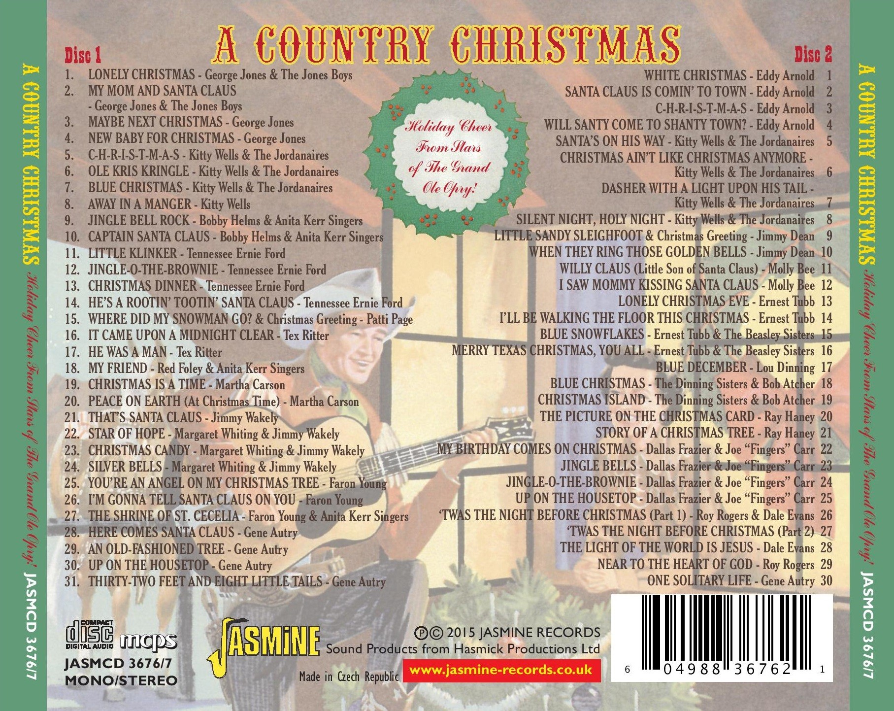 The great GEORGE JONES is heard on four rare tracks; KITTY WELLS performs eight fine Christmas songs (in stereo); four great early tracks feature mega-star TENNESSEE ERNIE FORD; Western stars - TEX RITTER, ROY ROGERS, DALE EVANS, GENE AUTRY, and JIMMY WAKELY - are featured; JIMMY DEAN, MOLLY BEE, EDDY ARNOLD, THE DINNING SISTERS, PATTI PAGE and FARON YOUNG are included.