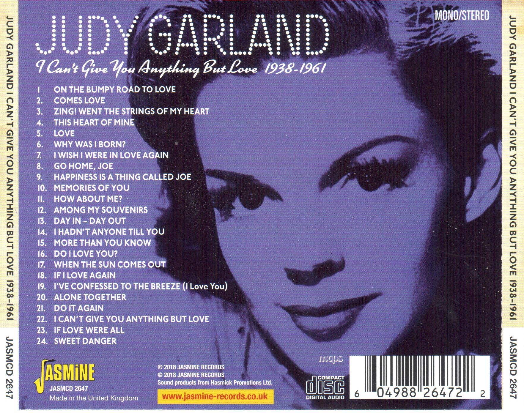Here then for the first time on JUDY GARLAND: I CAN'T GIVE YOU ANYTHING BUT LOVE is Garland's take on the vicissitudes of love sought, love lost, love remembered. Based on studio sessions for MGM, Decca Records, Columbia Records, and Capitol Records, radio dates and live recordings all made between 1938 and 1962, the anthology, featuring songs by many of the great songwriters of the Great American Songbook, captures Garland's voice in youth, as a young lady, and as the mature artist. Both exuberant and melancholic at the same time, Garland's voice could take you from the ecstatic highs of love first encountered to the mournful lows of separation, and, above all, all the in-betweens of longing that were her specialty.