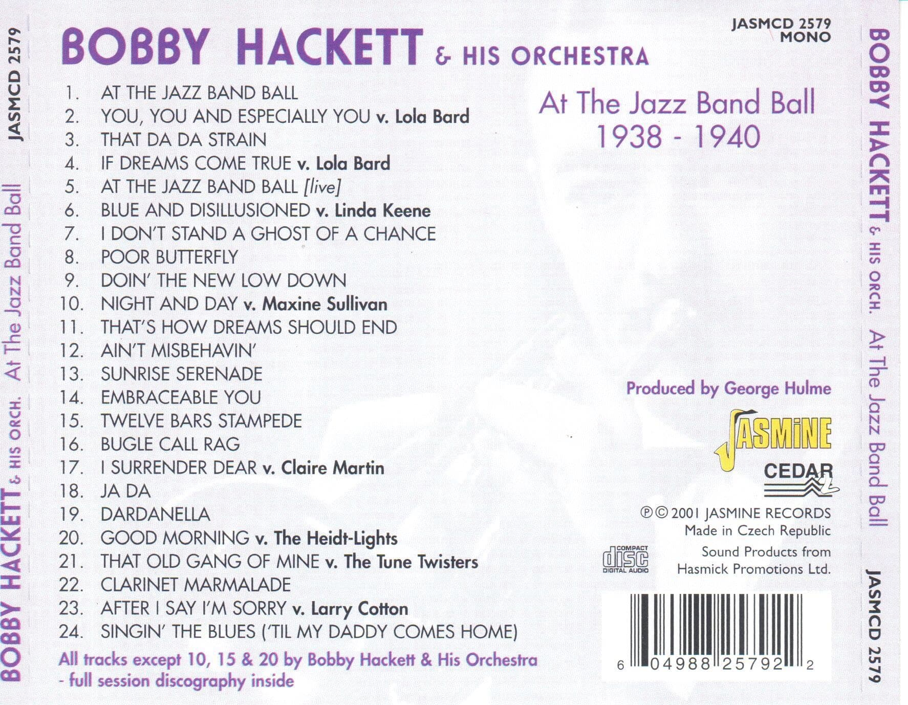 The two instrumentals from the first session, "At The Jazz Band Ball" and "That Da Da Strain", are typical Dixieland fare with interesting solos, especially from Pee Wee Russell. The other two sides, "You, You And Especially You" and "If Dreams Come True", are more commercially designed and have vocals by Lola Bard. The live version of "At The Jazz Band Ball" taken from a "Saturday Night Swing Club" broadcast, provides an interesting comparison with the one from the studio recording session and the solos are rather different, as one might expect from a jazz group."Blue And Disillusioned", with a nice vocal from Linda Keene, is the attempt for commercial success from the second session with two sides, "Ghost Of A Chance" and "Poor Butterfly", designed to show off Hackett's playing. The final side, "Doin' The New Lowdown", is more of a group jazz vehicle with good solos.Even as early as 1938 he had acquired a reputation for his ability to enhance the performance, not only by his discrete embellishments behind the vocal but his sympathetic solos as well. This dual ability is beautifully illustrated on Maxine Sullivan's "Night And Day".There are two outstanding Hackett performances on the standards, "Ain't Misbehaving" and "Embraceable You".Two sides with Hackett as leader have vocals and were obviously intended to strike a more commercial note but the two instrumentals, "Clarinet Marmalade" and "Singing The Blues", show Hackett at his best especially in his tribute to Bix Beiderbecke on the second of these - not that he recreates either the style or the sound of Bix but the flavour is certainly present.