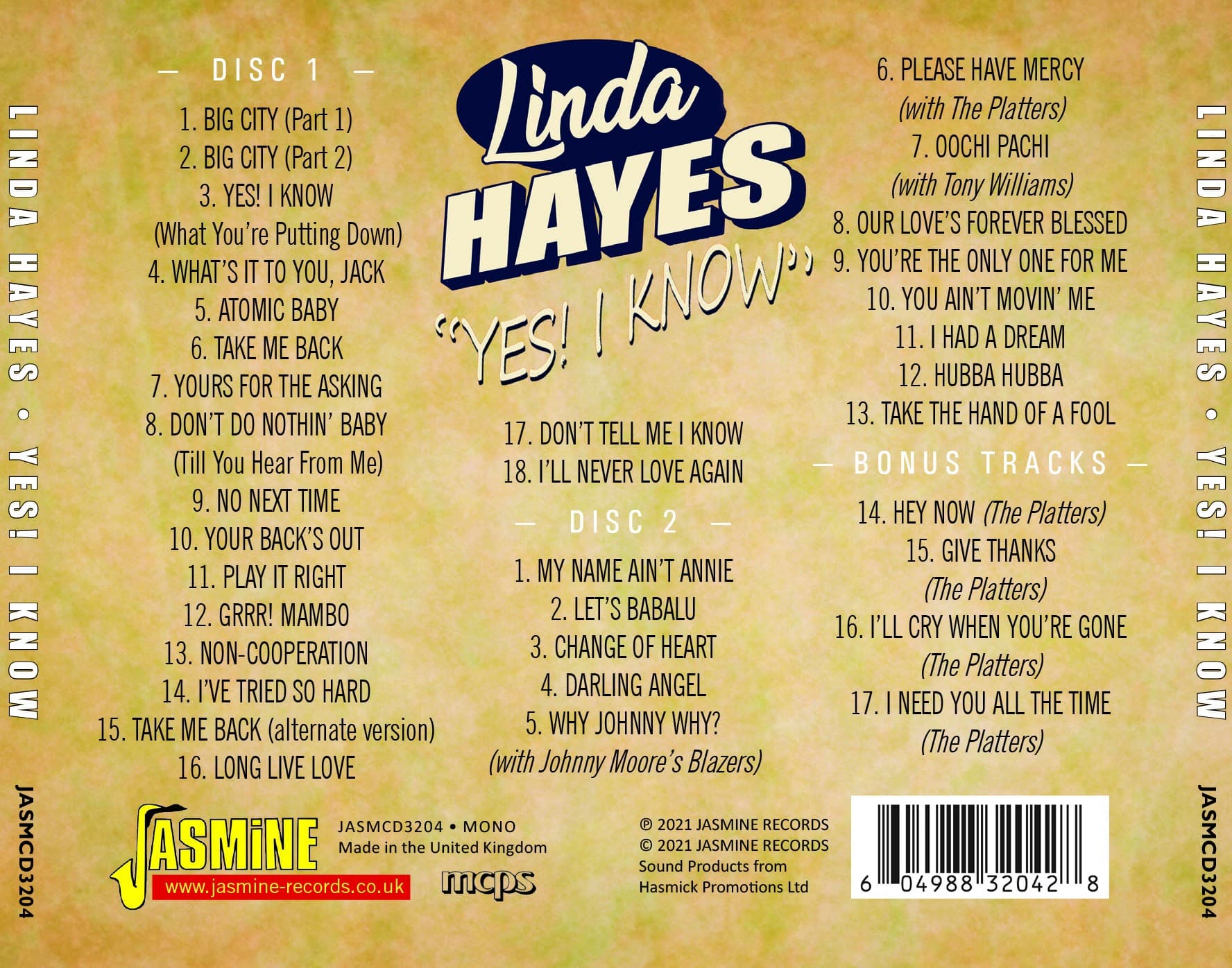 Gospel singer LINDA HAYES' short secular career got off to a great start with a pair of major R&B hits, 'Yes! I Know (What You're Putting Down)' (the answer-disc to Willie Mabon's 'I Don't Know'), which reached #2 and 'Take Me Back', which made the Top 10, both in 1953.