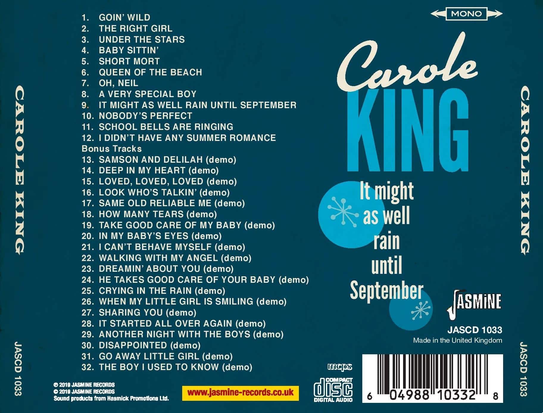 Although she regarded herself purely as a songwriter in her early career, CAROLE KING cut a half-dozen singles between 1958-62, most notably her million-selling, 1962 worldwide hit 'It Might As Well Rain Until September'.