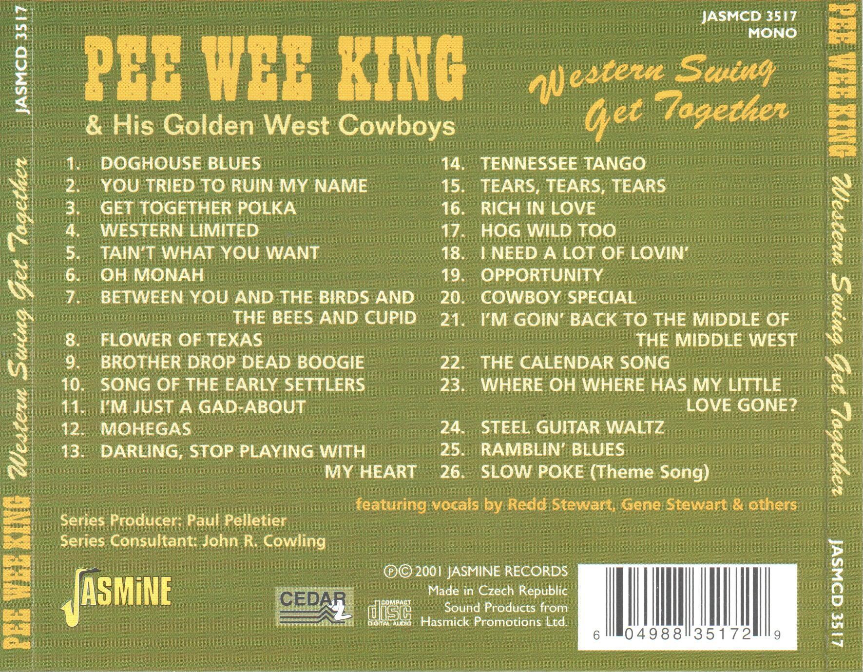 Although Pee Wee King remained leader of a very popular Western Swing band well into the 1950s, eventually the Rock ‘N’ Roll craze spelt the end for his kind of music. At the end of the 1950s, he broke up his band but continued to tour with Redd Stewart in Minnie Pearl’s Roadshow, continuing to run the show after she retired in 1964 until 1968. In the 1970s, he devoted himself to business interests which included a booking agency and music publishing (he had been involved in the writing of more than 400 songs). In 1974, he was elected to the Country Music Hall of Fame. Presented here are rare studio recordings from the 1950s, showcasing the very polished Western Swing style of Pee Wee King and His Golden West Cowboys, with King’s own accordion much in evidence and the Stewart boys dividing the vocals.