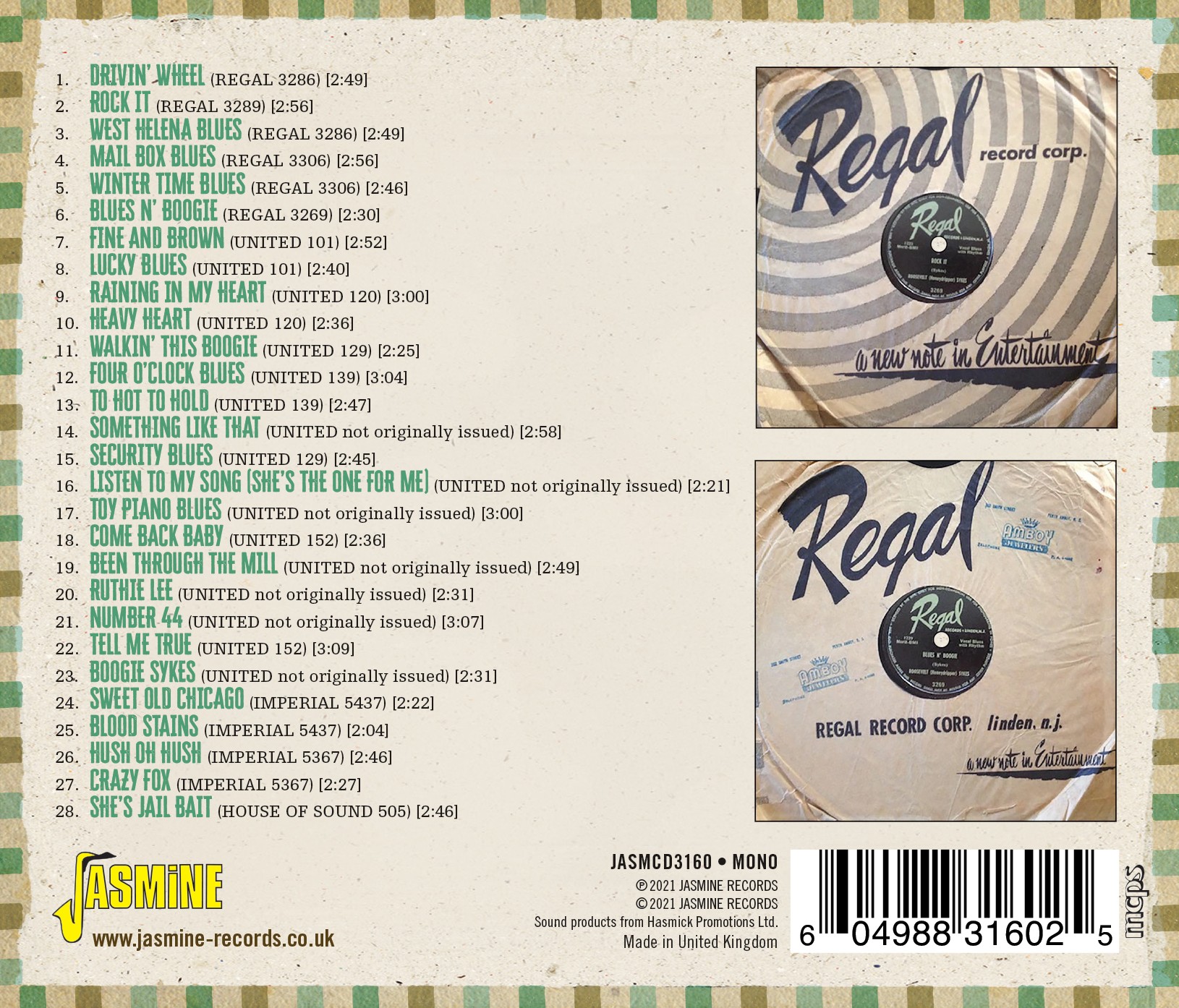 From the opening track 'Drivin' Wheel' through to 'She's Jail Bait' you'll be treated to his pounding piano boogies and risqué lyrics - all of which made Roosevelt so entertaining.