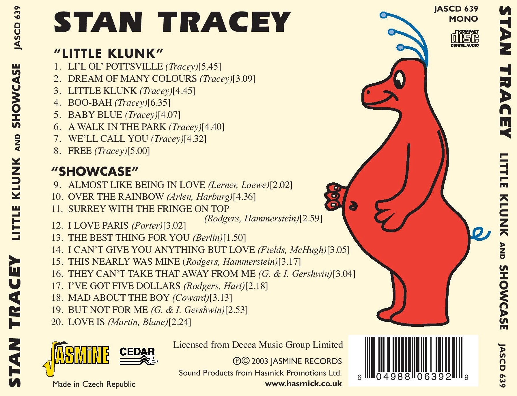 Stan Tracey is one of the finest jazz pianists and composers, not merely in his native Britain, or in Europe, but in the world. This is a welcome re-issue of two albums from the late 1950's. Showcase is a collection, as one may guess, of songs from musicals, many which have become standards in the jazz world. Here, Tracey is still finding his feet, as it were, on the piano, and his distinctive style hadn't fully formed. That isn't to say it's not superbly executed: it's a very enjoyable set. Little Klunk, named after a cartoon character, came a year afterwards, when Tracey's distinctive, indeed unique, style had fully emerged. Backed by Kenny Napper And Phil Seaman, Tracey's composing and playing are first-rate. It's all great stuff, but listen most of all to the brooding masterpiece "Boo-Bah".