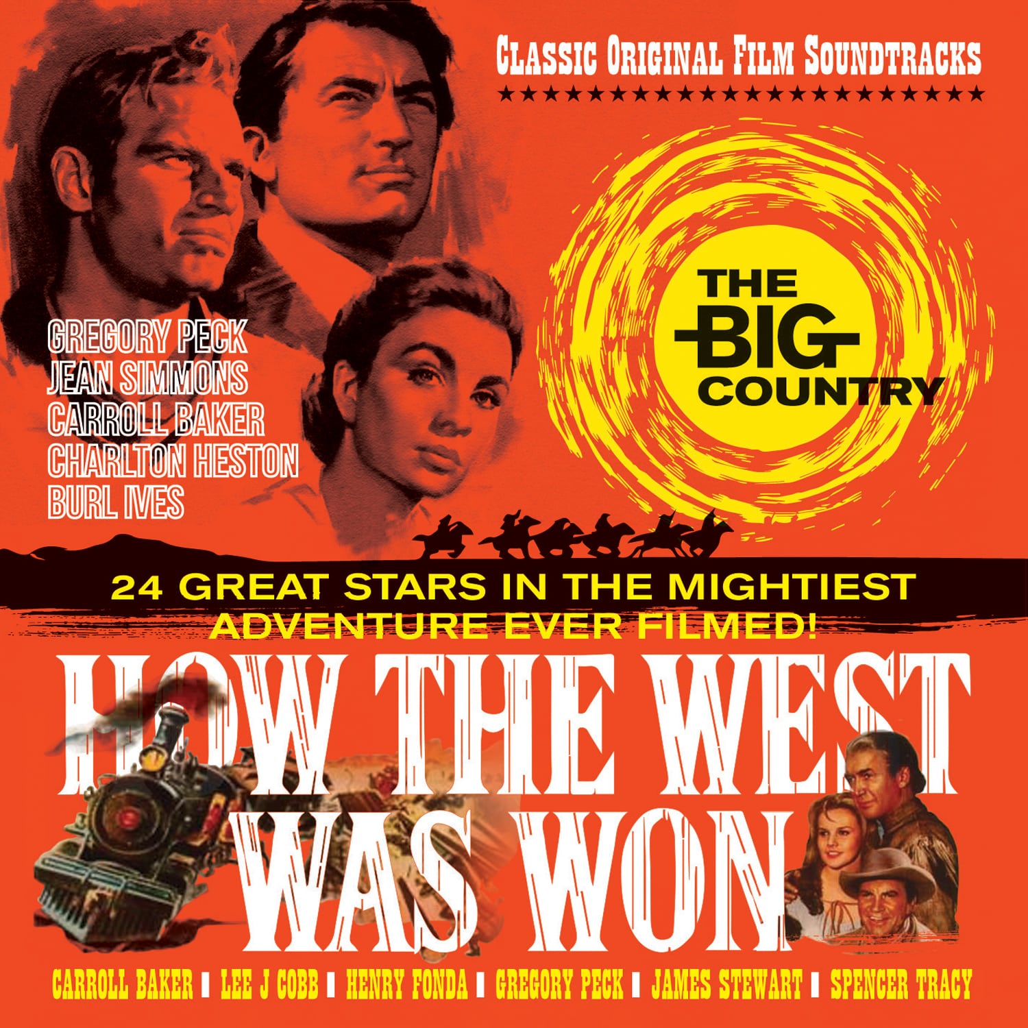 First up is Jerome Moss' Oscar nominated soundtrack for 'The Big Country'. A sprawling high budget western adventure produced and directed by William Wyler. Starring Gregory Peck, Charlton Heston, Jean Simmons, Carroll Baker, Charles Bickford and Burl Ives, the film was a major box office hit yet the soundtrack never charted. The second soundtrack on this collection is Alfred Newman & Ken Darby's 'How The West Was Won' was an equally high budget and sprawling western starring James Stewart, Henry Fonda, Carroll Baker, Debbie Reynolds, John Wayne and Gregory Peck and did chart peaking at No. 4 on the Billboard Top 200 Album Chart. The film itself was also a big success being nominated for eight Academy Awards and eventually winning three.