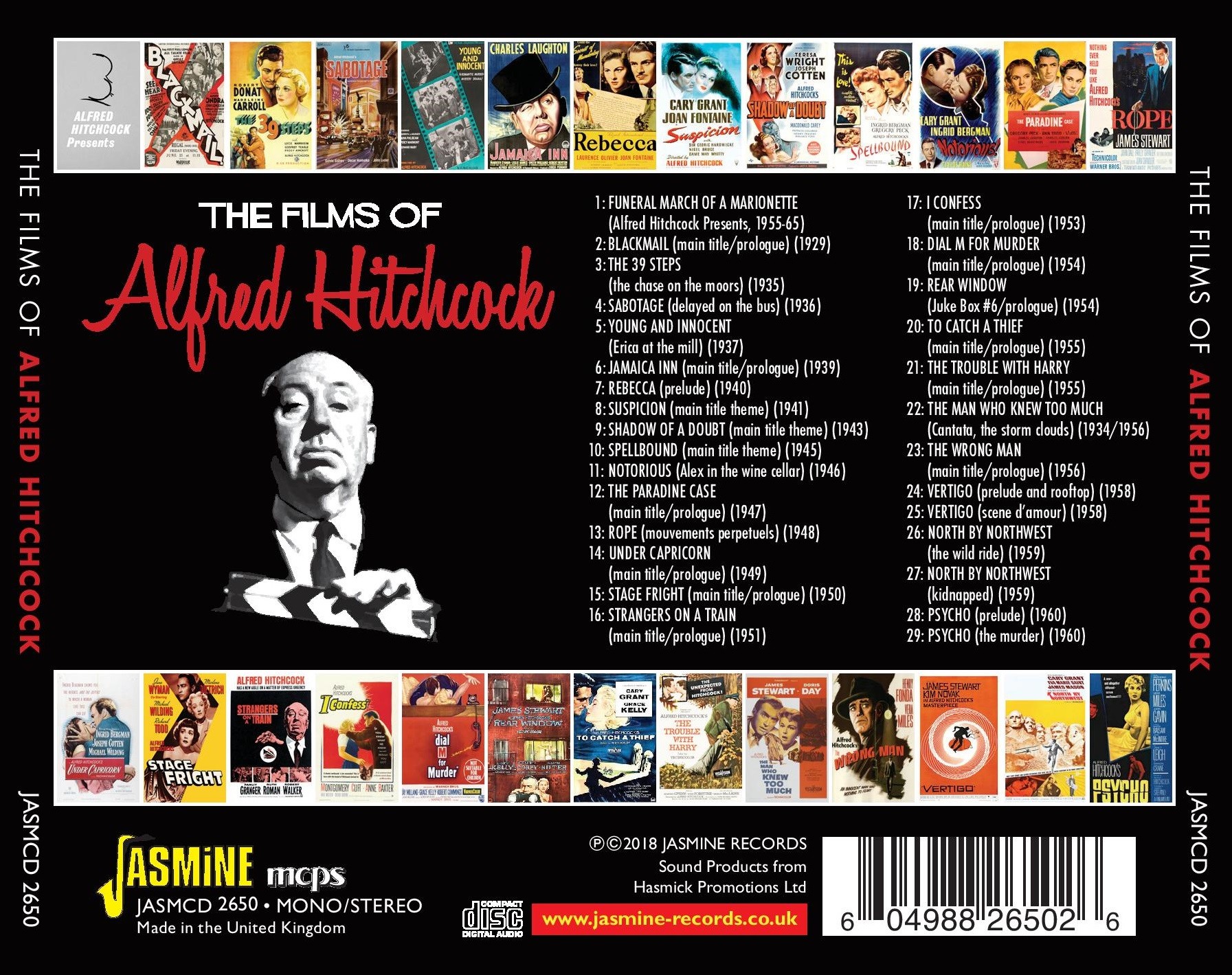 This unique compilation features main title themes and signature music from twenty-five of his biggest movies, proceded by 'Funeral March Of A Marionette', the theme to his hugely-popular TV series, 'Alfred Hitchcock Presents' (CBS/NBC, 1955-65).