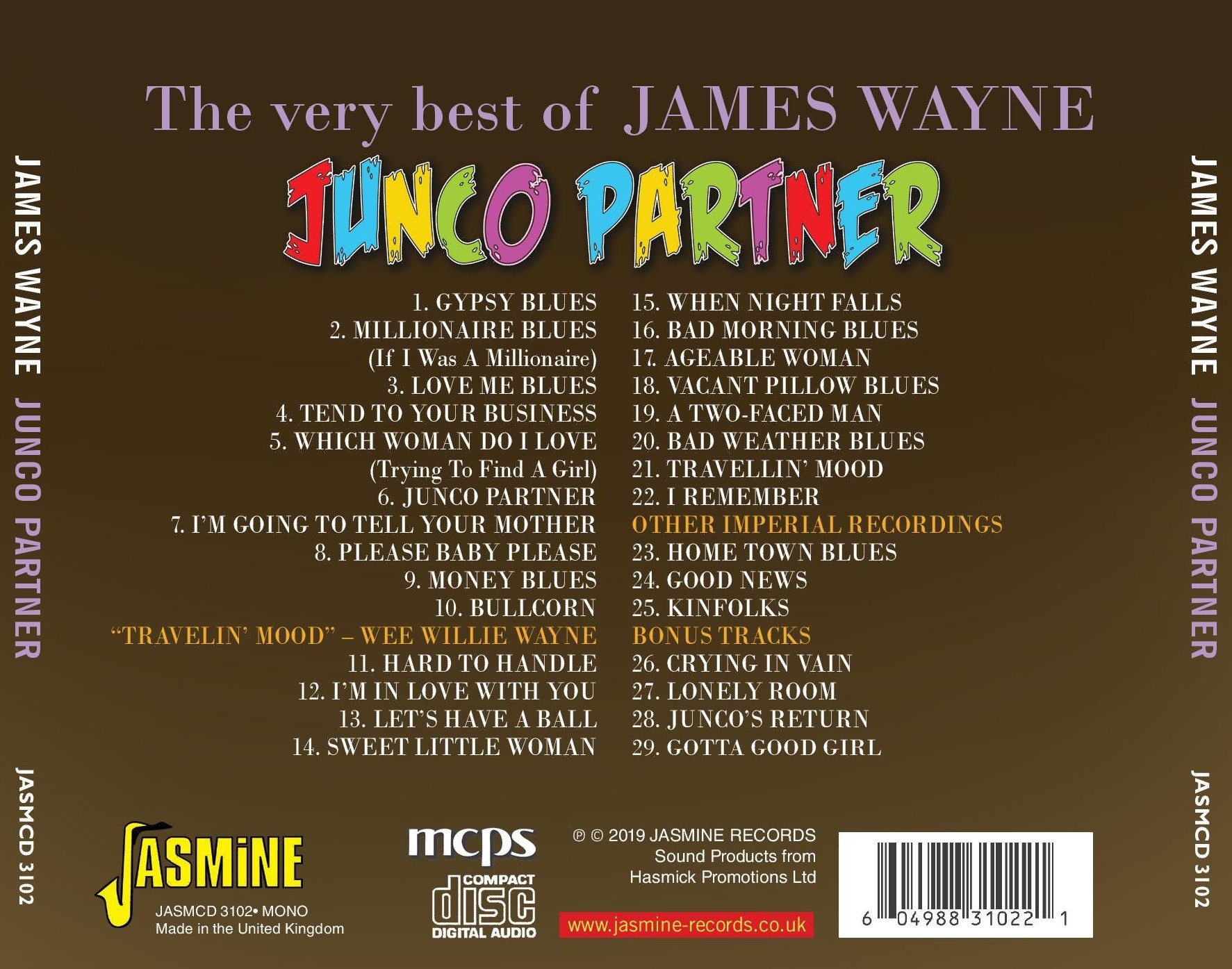 James Wayne (aka Wee Willie Wayne) was a unique and original sounding singer and songwriter. Here Jasmine has put together his LP 'Travellin' Mood' with his recordings for Bob Shad's 'Sittin' in with' label plus some bonus singles.